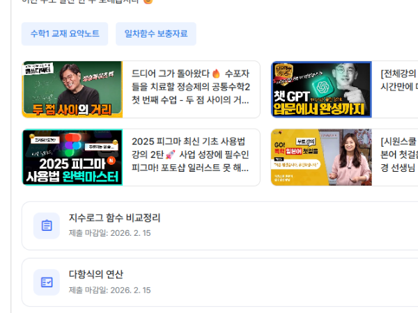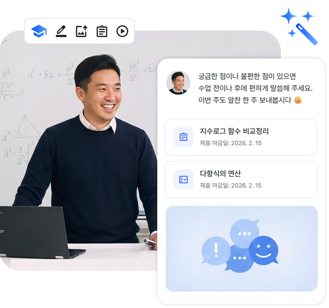 영상, 자료, 과제, 시험을 미리 등록해두고 필요한 수업에 연결해 사용할 수 있습니다. 수업 일정에 맞춰 콘텐츠를 구성하면 학생들에게 바로 제공됩니다.